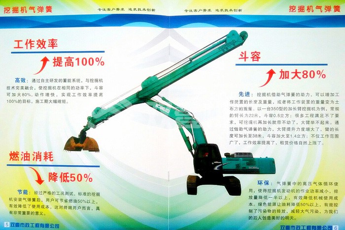 環(huán)保:氣彈簧中的高壓氣體循環(huán)使用,使得挖掘機(jī)發(fā)動(dòng)機(jī)的作業(yè)功率減小,排放量降低一半以上,有效降低機(jī)械使用成本。綠色能源讓油耗降低50%以上,有效控制了污染物的排放,減輕大氣污染,為我們的后人創(chuàng)造美好的明天。