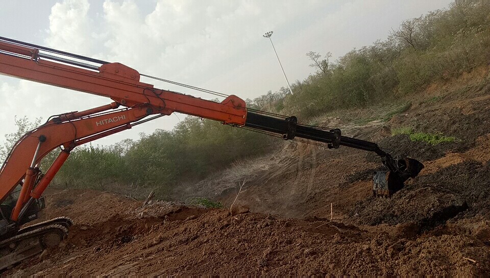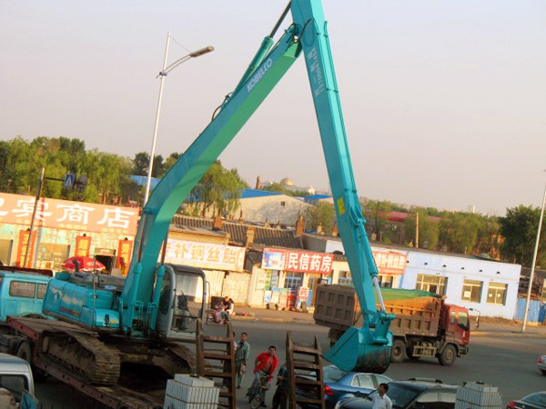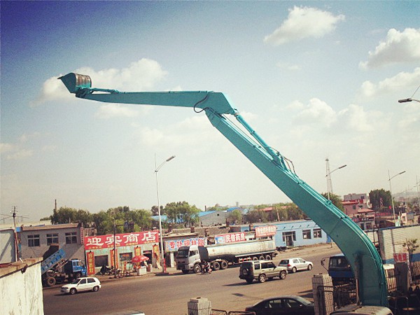 加長臂是我們最常見,使用時間更早的大臂與小臂同時加長的臂,它不需要伸縮缸的控制。它使用薄些的板材,來減輕臂的重量..